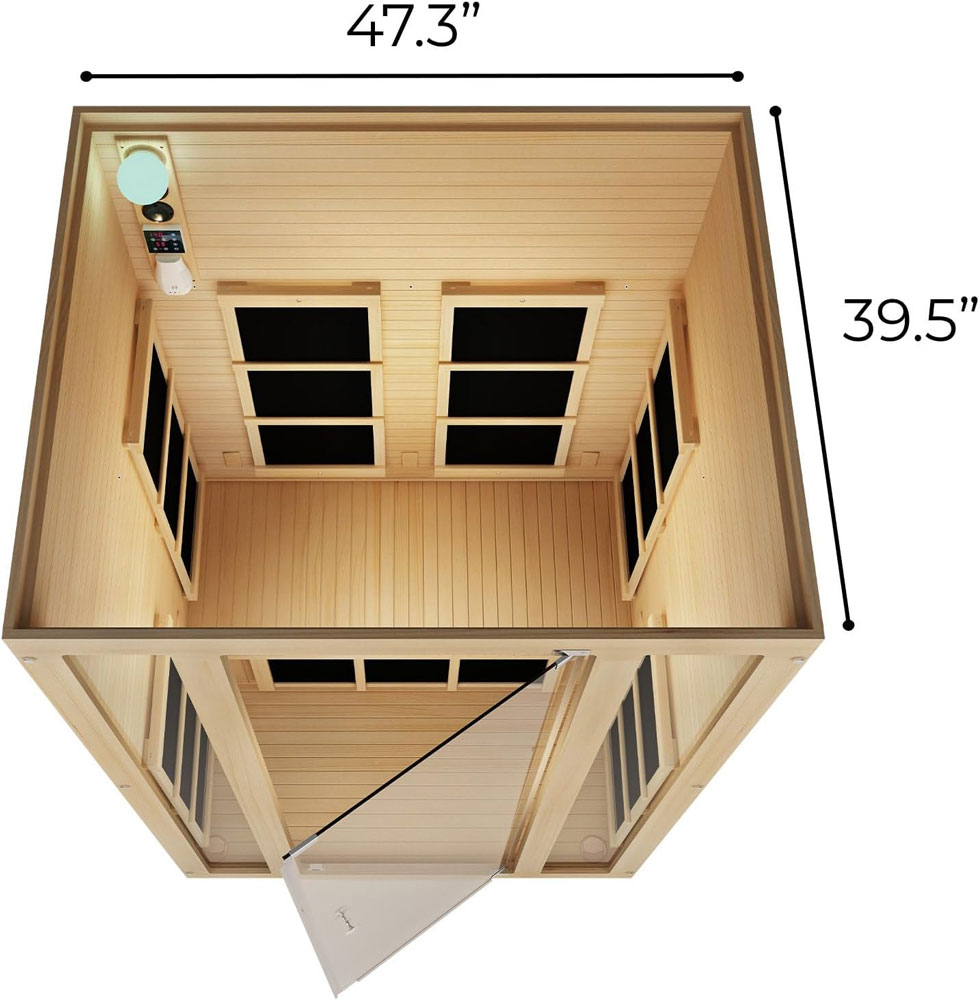 This infrared sauna features 7 carbon fiber heaters position at the back, side, and calf areas of its Canadian hemlock wood housing. Tongue-and-groove construction contributes to the sauna's structural stability, and the absence of added chemicals to the wood contributes to its users' enjoyment of the experience without suffering migraines and nausea.