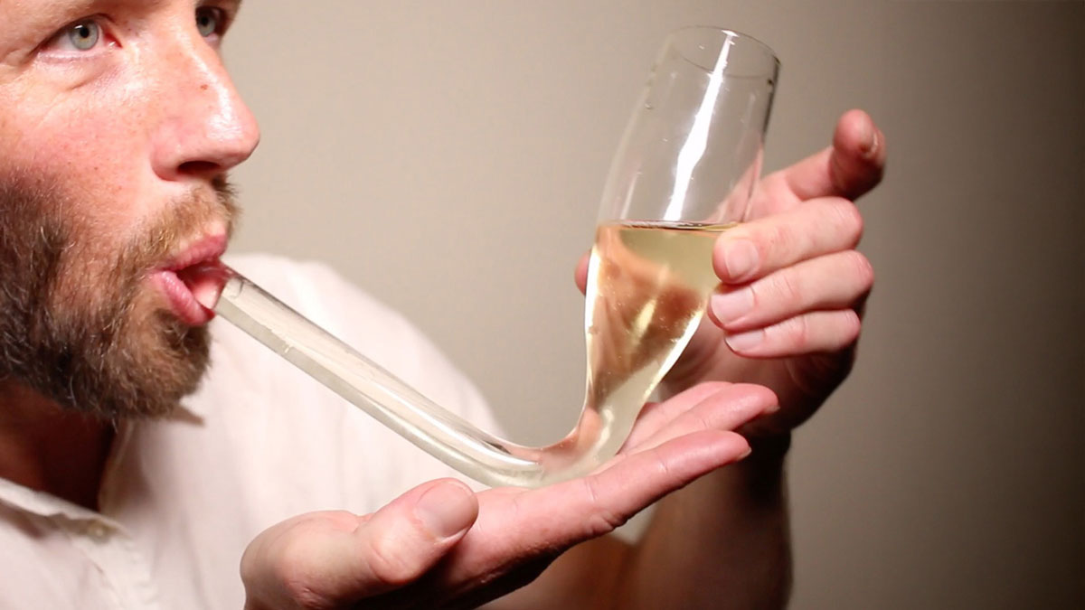 The Chambong holds 6 ounces of your favorite effervescent grapes between its hand-blown glass walls. Dishwasher-safe hand-blown glass walls, in case someone similar to myself taking a turn can't stand the fizz, and ends up slobbering and coughing as much back into the Chambong as they just sucked out of it.