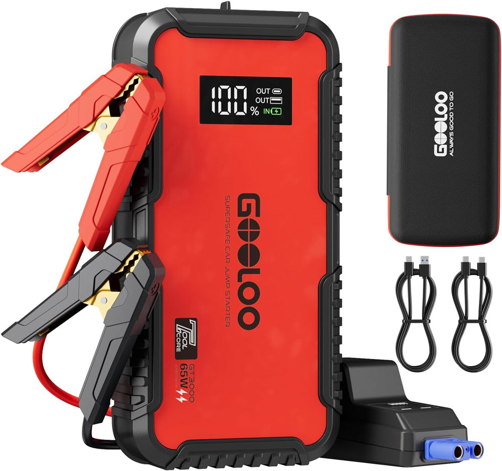 GT3000 Portable Jump Starter weighs just 1.3 pounds, and comes with jumper cables for car battery use, as well as a hard-shelled storage case for safe-keeping in your glovebox.