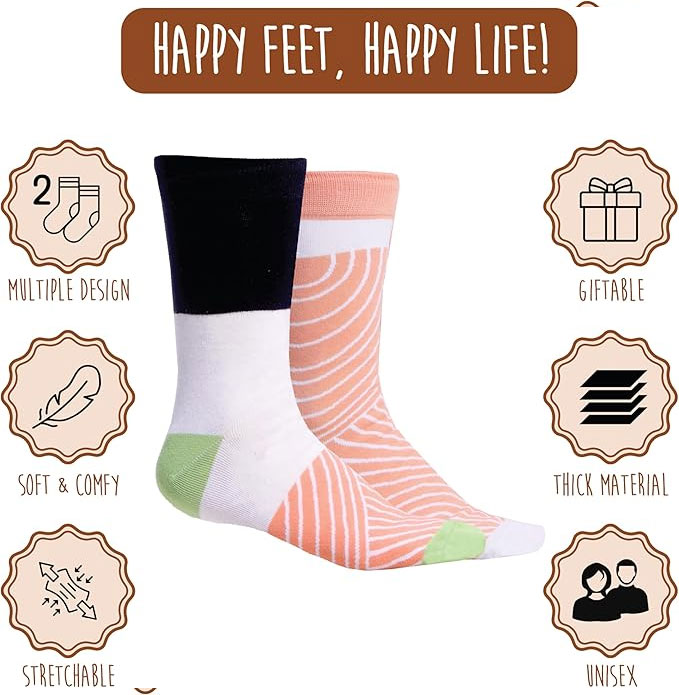 Sushi socks obviously look most authentic when rolled up, but even with the expertly cut salmon unraveled and covering the entirety of your arches and shins there is no doubt they came straight from Japan. The listing here includes 2 pairs of socks, displayed in a to-go sushi box as duos of salmon nigiri and salmon rolls.